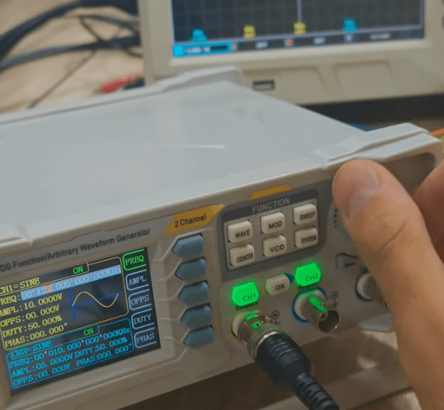 Lövhənin sol tərəfində dəyişən gərginlik mənbəyinə qoşulmuş 2 ardıcıl rezistoru breadboard üzərində qurmaqla tezliyin dəyişməsinin aktiv müqavimətə təsiri olmadığını və dolayısı ilə həmin rezistor üzərinə düşən gərginliyin də dəyişmədiyini təcrübə edirik. Dəyişən gərginlik mənbəyi olaraq siqnal generatorundan və gərginliyin dəyişməsini müşahidə etmək üçün osilloqrafdan istifadə edirik. Gördüyünüz kimi siqnal generatorundan tezliyi artırdığımız və ya azaltdığımız zaman gərginlik sabit qalır (sadəcə zaman aralığı dəyişir). Tezliyin dəyişməsi aktiv müqavimətə təsir etmir, yalnız reaktiv müqaviməti (induktiv və tutum) dəyişir.
