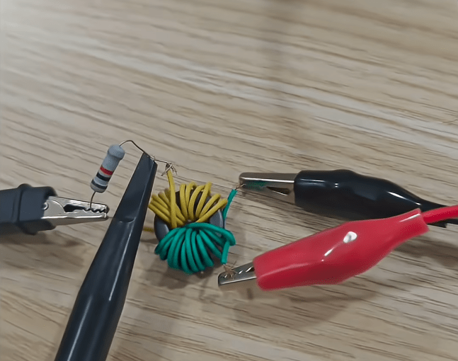 Ferrit nüvəsi ətrafına giriş və çıxış dolaqları sarınıb. Bununla transformatorun əsas iş prinsipi praktiki olaraq göstərilir. Daha sonra siqnal generatorundan giriş dolağına gərginlik verilir. Çıxış dolağı isə osiloqrafafa qoşularaq gərginlik ölçülür