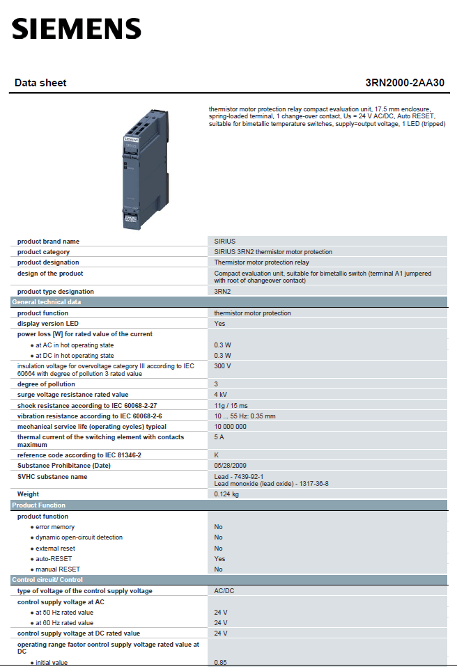 Aşağıda SIEMENS firmasının SIRIUS brendinə aid 3RN2000-2AA30 nömrəli termistor relesinin datasheetinə baxaq. Mühərriklərə quraşdırılmış termistorlar bu relelərə bağlanır və mühərrik çox qızdıqda rele “tripped” rejiminə keçir və çıxış kontaktını dəyişir.