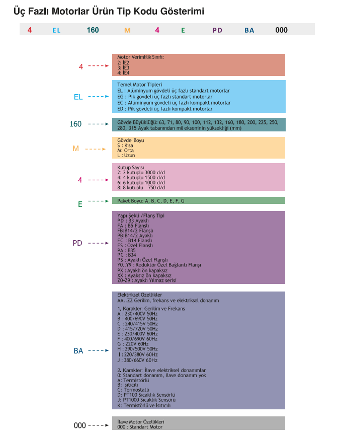 Bu şəkildə 4 EL 160 M 4 E PD BA 000 kodlu mühərrik nümunəsi göstərilib. Məsələn, burada ilk yerdə yazılan 4 rəqəmi əvəzinə 2 rəqəmi yazılsa, bu mühərrikin IE2 enerji sinfinə aid olduğunu göstərir. 5-ci yerdəki 4 rəqəmi isə qütblərinin sayını bildirir. Bu rəqəmlər istehsalçının özü tərəfindən müəyyənləşdirilir və hər bir istehsalçı üçün fərqli ola bilir. Bu kataloqun tam versiyasında hər bir yazılan ölçü və ilə bağlı ətraflı məlumat qeyd olunub. Məsələn, PD – B3 ayaqlı bağlamanı bildirir, bu məlumat tam olaraq informasiya vermir. Amma növbəti səhifələrdə həmin bağlantı şəklinin çertyoju göstərilib.